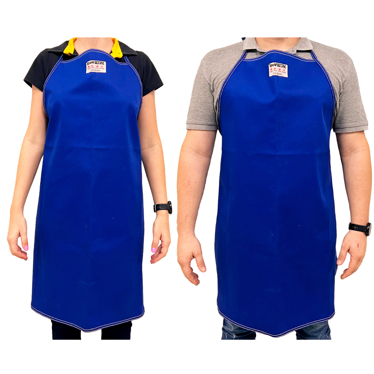 Avental de segurança confeccionado em tecido de algodão, com tratamento antichamas e impermeabilizado em silicone, costurado com linhas de para aramida, ajustável através de tiras nas costas, sem forro.