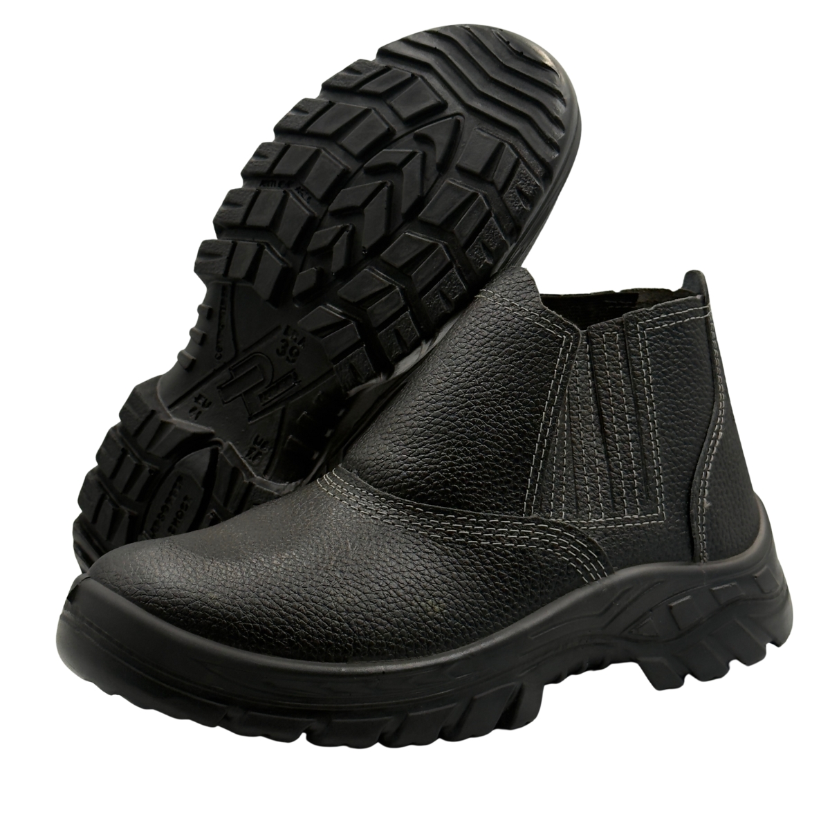 Botina de segurança,confeccionado em couro vaqueta com estampa Relax, fechamento em Elástico, biqueira de polipropileno e solado PU injetado diretamente no cabedal.