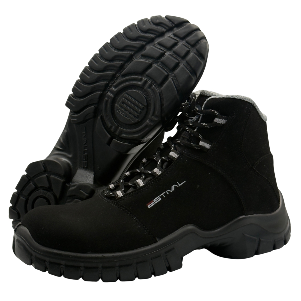A Bota de Segurança Estival Energy é confeccionada em microfibra com fechamento em cadarço na parte externa e interna do cano.