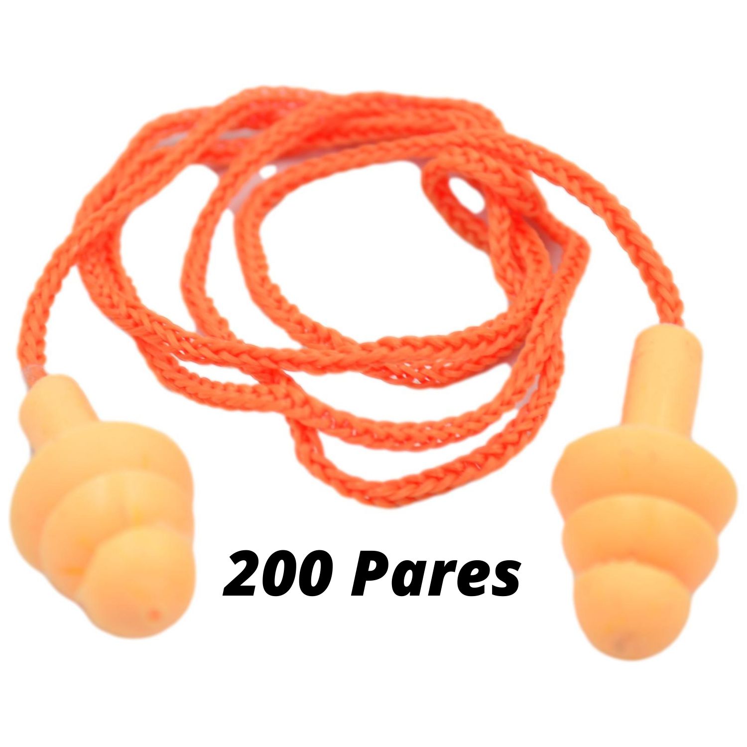 Protetor Auditivo auricular, confeccionado em silicone , tipo inserção, composto de um eixo com três flanges, onde a primeira, a segunda e a terceira, são flanges maciças e cônicas, todas de dimensões variáveis, contendo um orifício no seu interior, protetor tamanho único, moldável a diferentes canais auditivos, com cordão de algodão