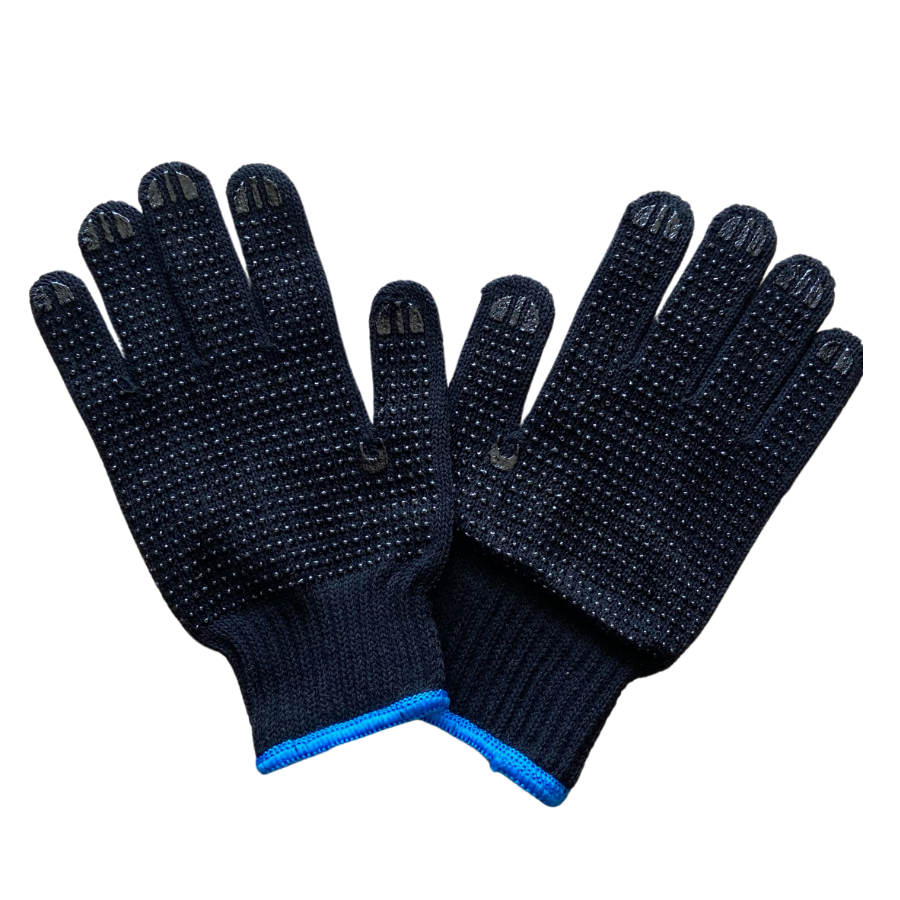 Luva de segurança Hand Black tricotada com fios de algodão e poliéster, palma e face palmar dos dedos com pigmentos antiderrapantes de PVC, punho com elastano.