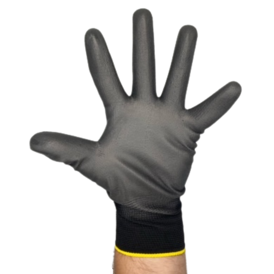 Luva de segurança confeccionada em fibras sintéticas, revestimento da face palmar e ponta dos dedos em poliuretano (PU), dorso ventilado, punho com inserções de fibras elásticas e acabamento em fibras sintéticas.